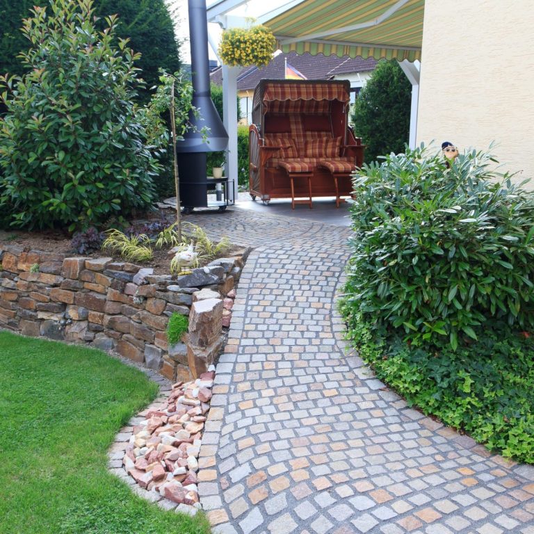 Dieser Bereich erhielt durch langlebiges Natursteinpflaster eine ansprechende und zeitlose Optik. Der Einsatz regionaler Materialien garantiert eine hohe Belastbarkeit und fügt sich ideal in die Umgebung ein.